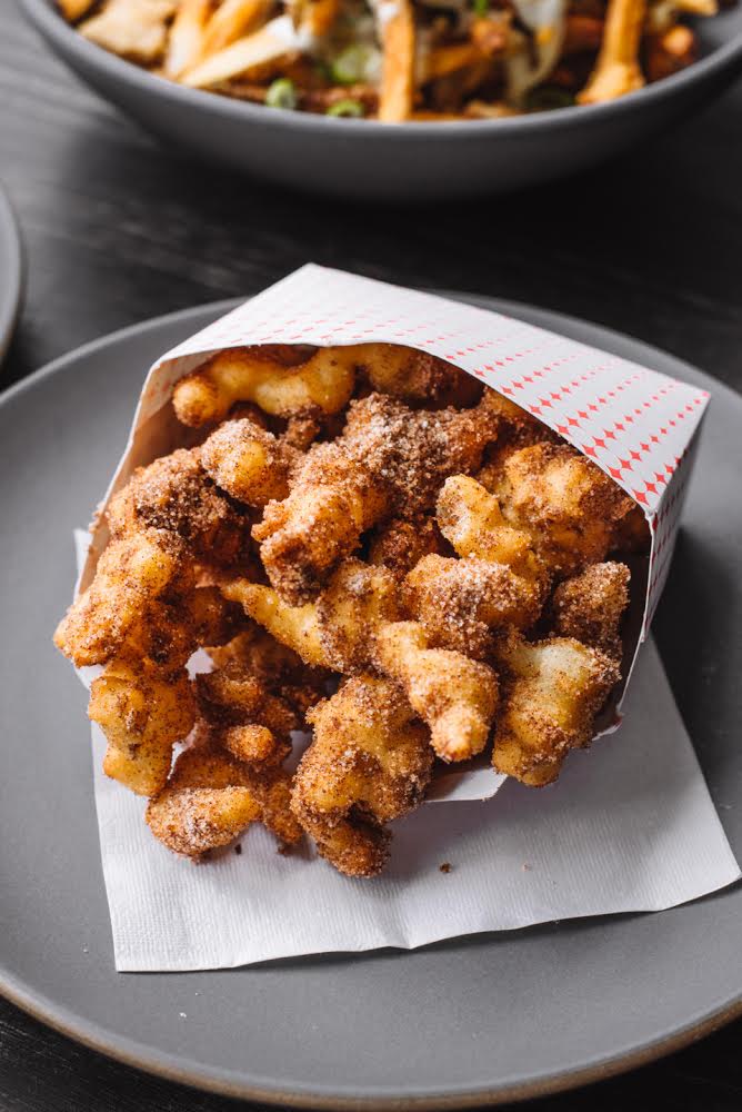 Guests can expect snacks like battered & fried onion rings and loaded frites, in addition to a menu that includes smash burgers, a fried chicken sandwich and a funnel cake with cinnamon sugar for dessert.